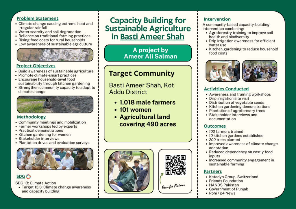 This training initiative focused on agroforestry, kitchen gardening, and climate-smart farming practices to strengthen resilience among local farmers and households. Conducted in Basti Ameer Shah, the sessions emphasized efficient water use, soil health, and sustainable food production.